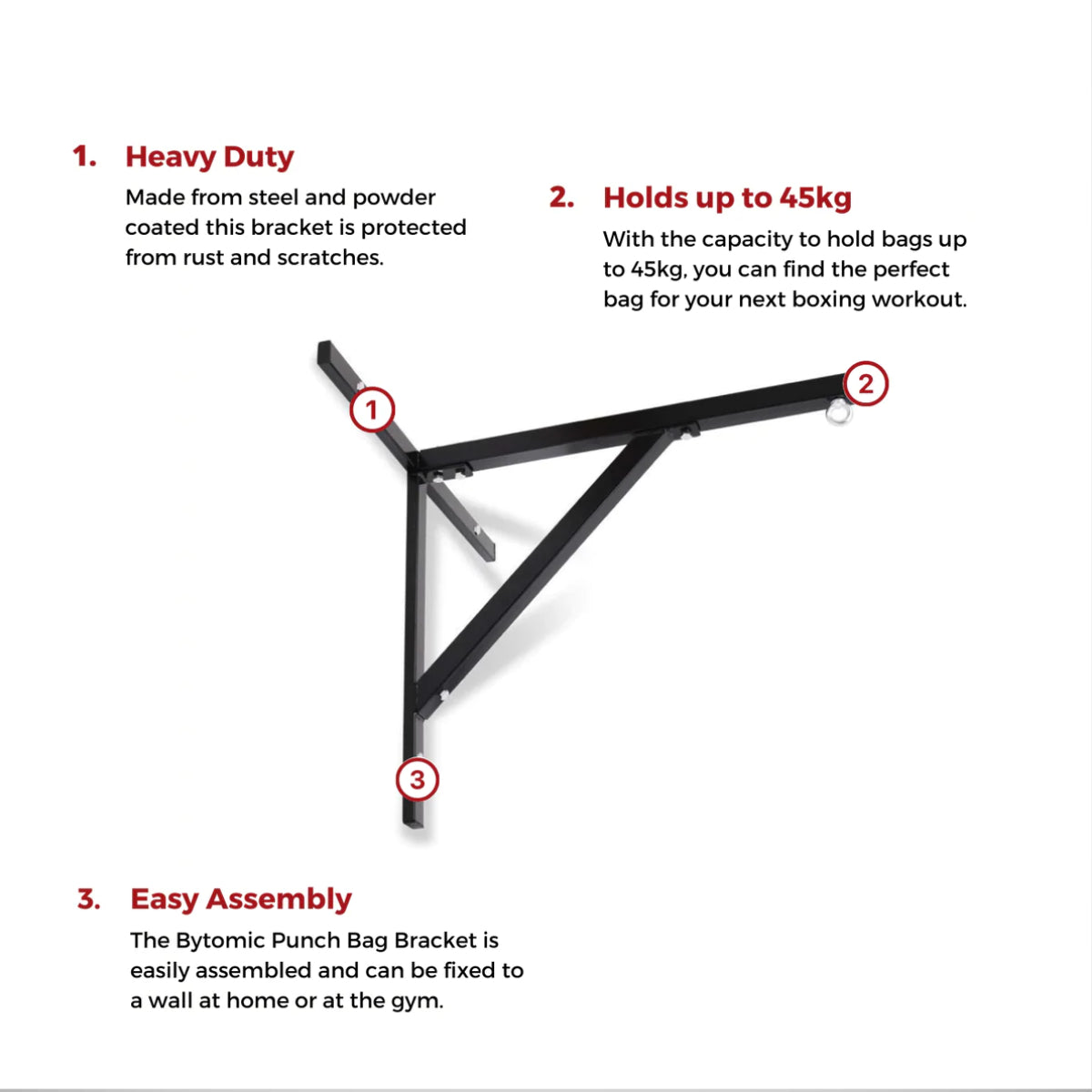 The Bytomic Punch Bag Bracket is easily assembled and affixed to your wall at home. Can hold bags up to 45kg. Powder coated steel with a black finish prevents rust and scratches ensuring this bracket lasts. 78x70x65cm (78cm from wall) Weighs 6kg this can hold up to 45kg Not to be used with Punch Bags for clinch work/hanging off the bag For commercial use we recommend our Heavy Duty Bracket.