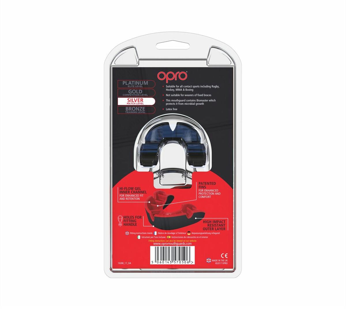 The durable outer layer of the dual layer Match Level Silver Self-Fit mouthguard from OPRO provides enhanced impact protection. Unique features of the Silver mouthguard include: Patented Fins provide a highly retentive fit after moulding Fitting Handle for ease of fitting Biomaster Antimicrobial Protection is proven to inhibit the growth of bacteria by up to 99.99% Dental Warranty up to 12,500 for added peace of mind Suitable for all contact sports The mouthguards stretch zones allow it to fit almost any mouth and the wide open palate makes speech and breathing easy whilst the mouthguard is being worn. The easy to fit mouthguard has 11 fins which break down on moulding to provide a superior custom-fit inner channel Specially designed case Latex Free Not suitable for wearers of fixed braces Suitable for age 10+