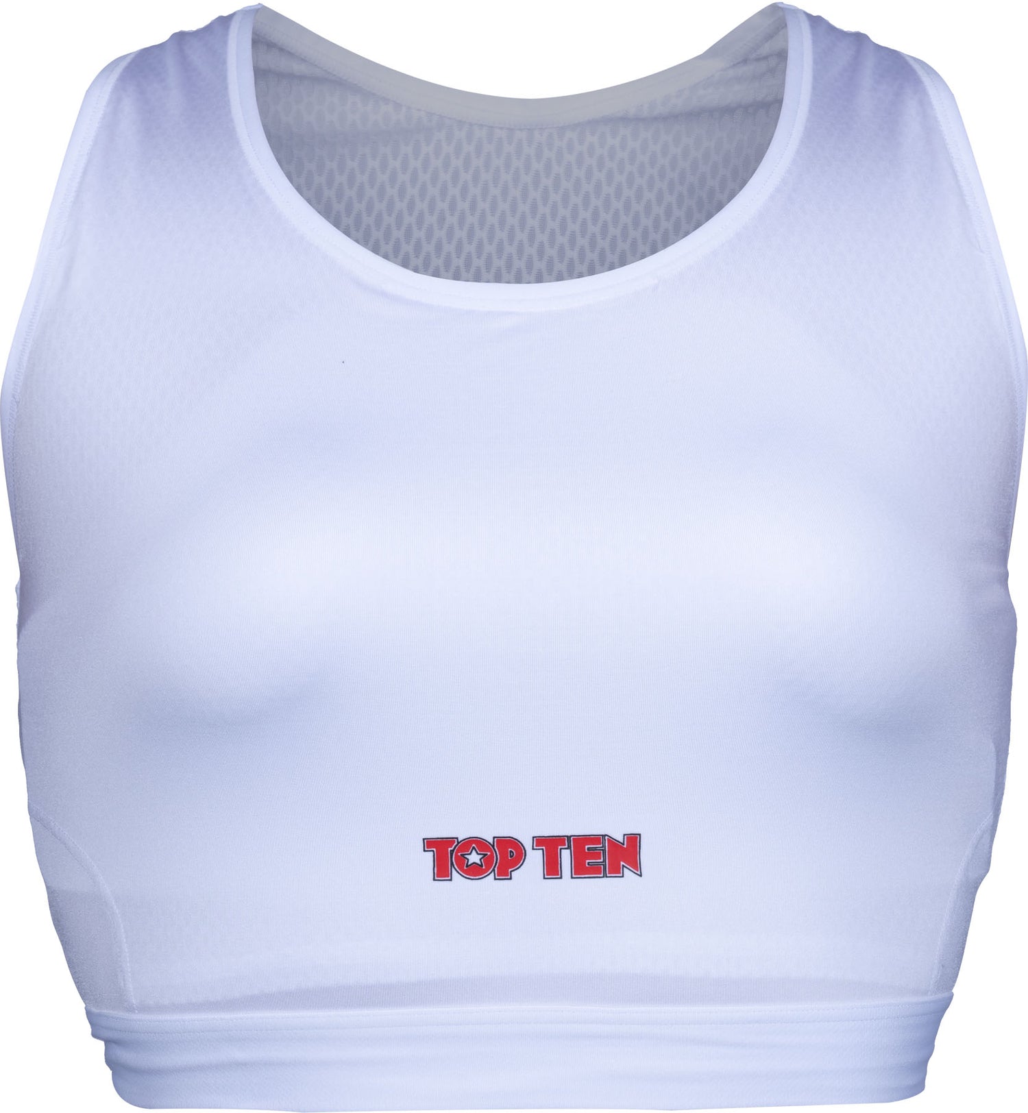 TOP TEN ensures the highest level of safety with the “Maxi” women's chest protector, including rigid plastic inserts. This combination of fabric and protector shell makes the hearts of martial artists beat faster because comfort and safety are not neglected. With its longer cut, the “Maxi” women's chest protector firmly encloses the entire upper body area. Thanks to the breathable and elastic material, you still feel completely comfortable and can calmly make your body sweat. Thanks to the carrier system, the TOP TEN “Maxi” has enormous support so that it effectively prevents postural and tissue damage.