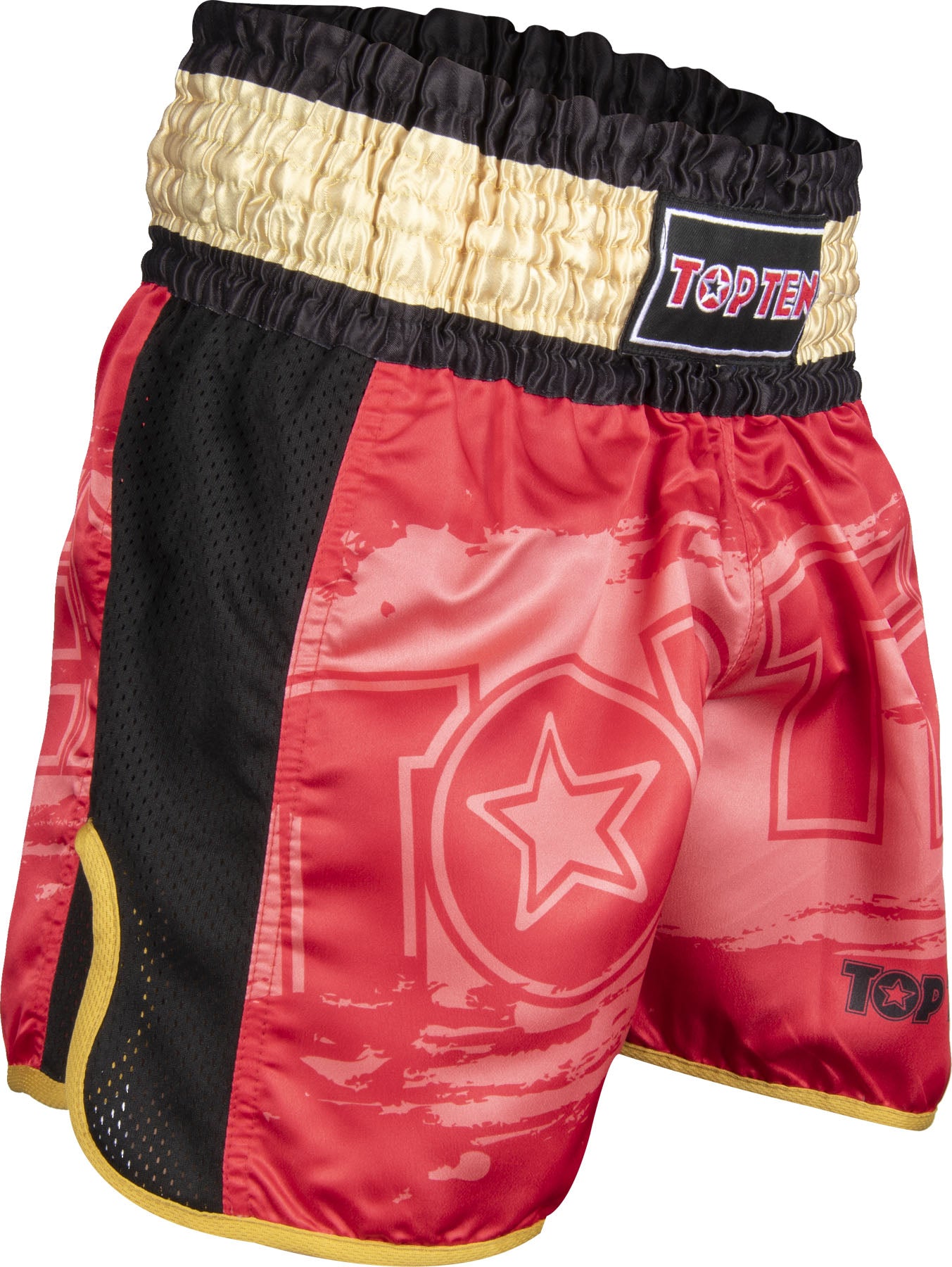Make it short and sweet, like the TOP TEN Thai shorts “Power Ink.” Don’t waste any thought on the perfect outfit for your next fight because these shorts guarantee full mobility in all directions. You can perform exceptionally high kicks and attacks with the knee in the light “Power Ink” shorts. With its quick-drying material made of glossy polyester satin, the integrated mesh stripes, and the extra high waistband, the “Power Ink” is not only convincing in Thai boxing. Still, it is also very much appreciated by athletes from kickboxing, Muay Thai and K1.