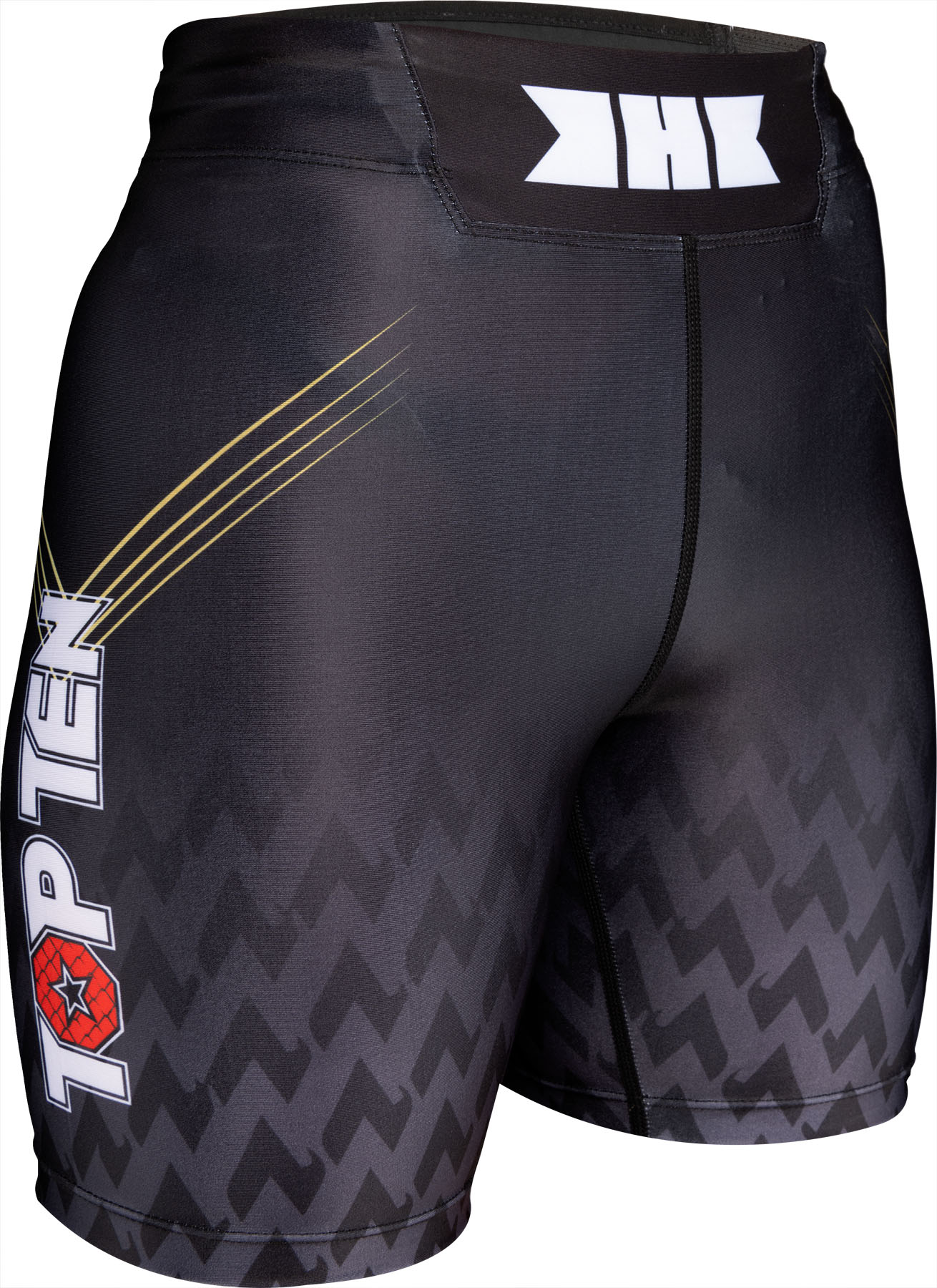 The “BRAVE” compression shorts from TOP TEN and the BRAVE® Combat Federation bring pure luxury to your sports equipment. The flexible super-stretch fabric supports your mobility and ensures targeted muscle contraction with strong fibers. A transparent anti-slip strip on the inside keeps the shorts in place, no matter how intense your workout is. The shorts stimulate your muscles and thus improve your performance.