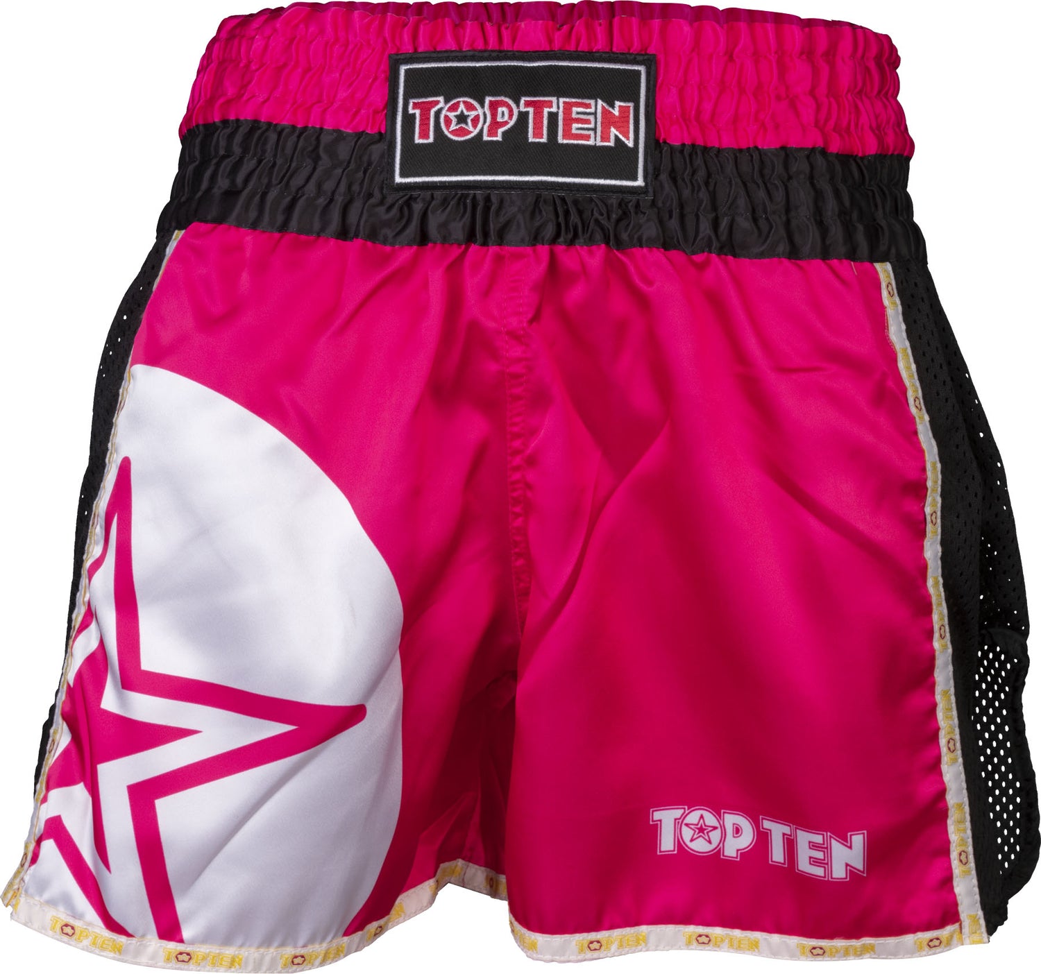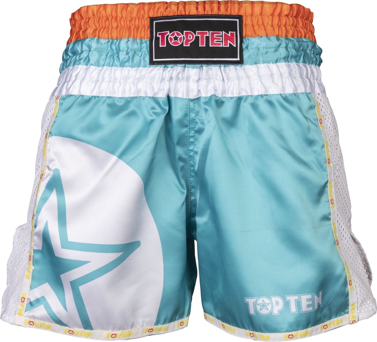 You can feel what makes good Thai boxing shorts with the “Star” from TOP TEN. These functional shorts are wholly dedicated to the demands of martial arts. A different shortcut and additional side cuts make them real movement artists. So that the “Star” always stays in place, it is equipped with a waistband that is almost 9 cm wide. TOP TEN provides a lot of variety with the variety of colors of the model. Colors and motifs are sublimated directly into the fabric on the smooth and slightly shiny polyester material. The “Star” is a natural lightweight with excellent climate management thanks to the side mesh inserts.