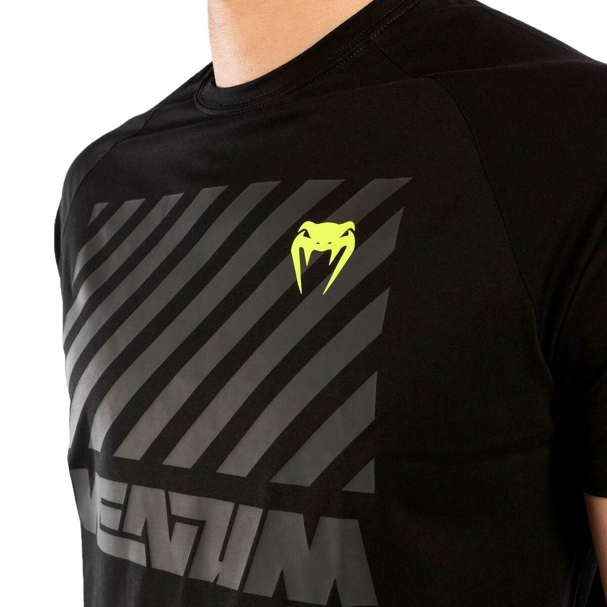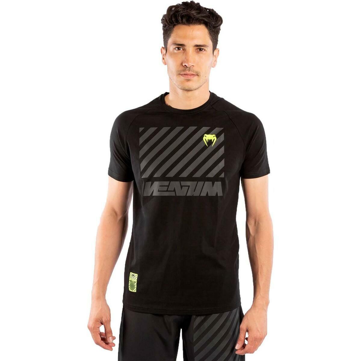 The Venum Stripes T-Shirt is an ultra-comfortable shirt with a bold futuristic look. Its tone-on-tone design is matched with delicate touches of yellow to give you that Venum touch. The 3D printing of the bands, located on the chest, makes it an original 100% "streetwear" t-shirt. TECHNICAL FEATURES 95% Cotton / 5% Elastane Fitted cut Quality screen printing 3D printing Venum logo Machine wash at 30 , do not tumble dry